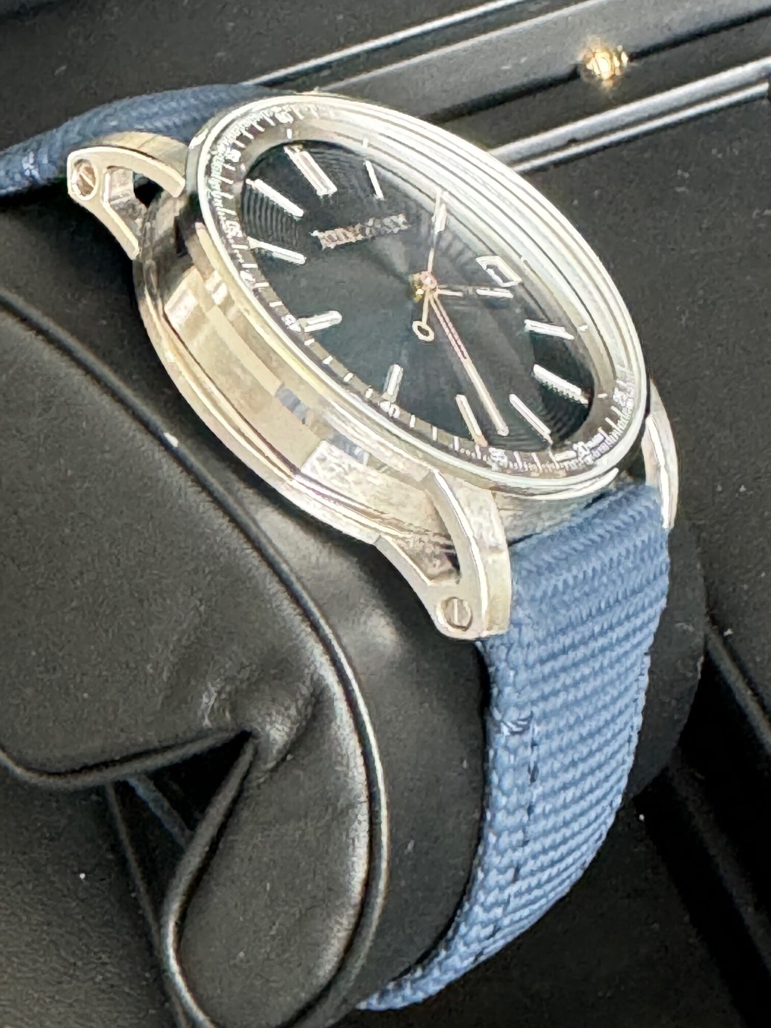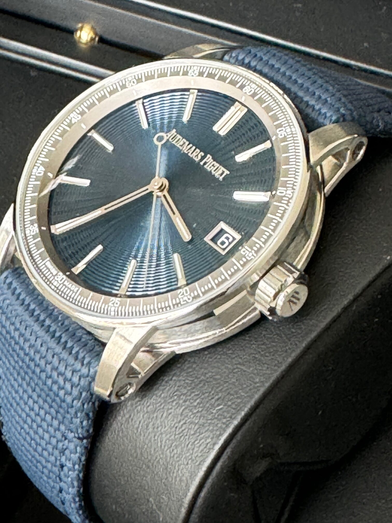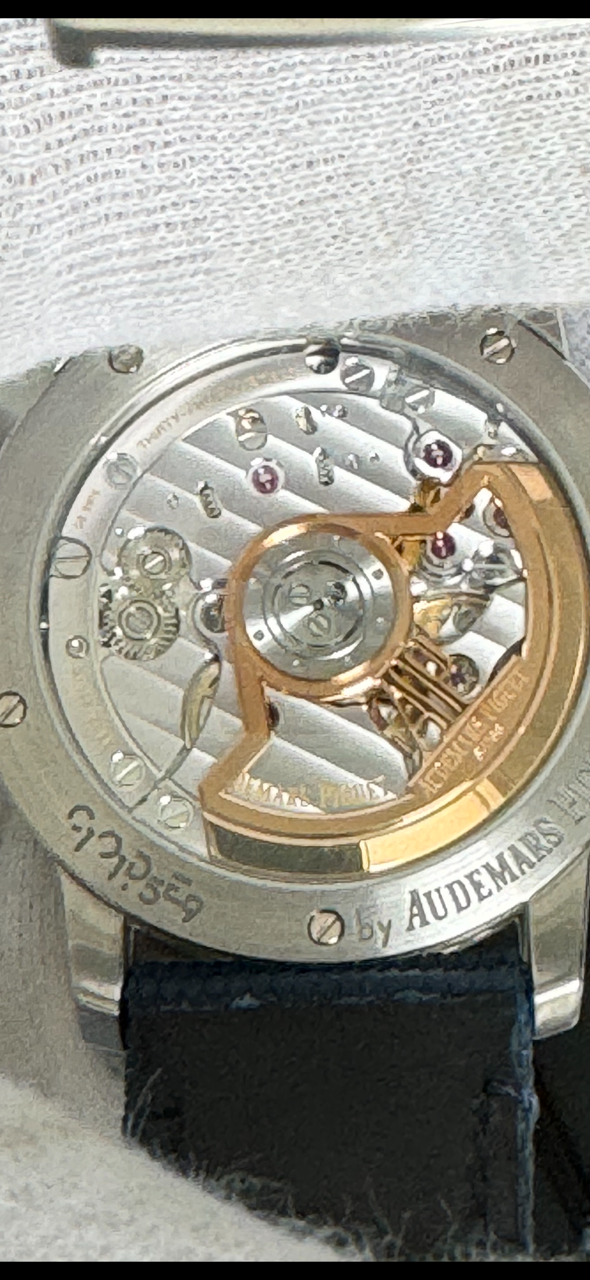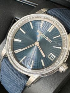 AP julkaisi mallin 2019 ja teräsversio, kuten tämä, julkaistiin 2023. Kellon koko on 41mm ja se istuu hienosti ranteessa. Ranneke on päältä tekstiiliä, alta nahkaa ja ranneke on kiinni kellorungossa ruuveilla. Kellorungosta ja sinisestä taulusta löytyy ihailtavaa, mutta koneistosta sitä vasta löytyykin. AP:n in-house cal. 4302-automaattikoneistolla on 70 tunnin käyntivara. Kello kestää 3 ATM (30m) paineen, eli sillä ei kannata mennä edes suihkuun.