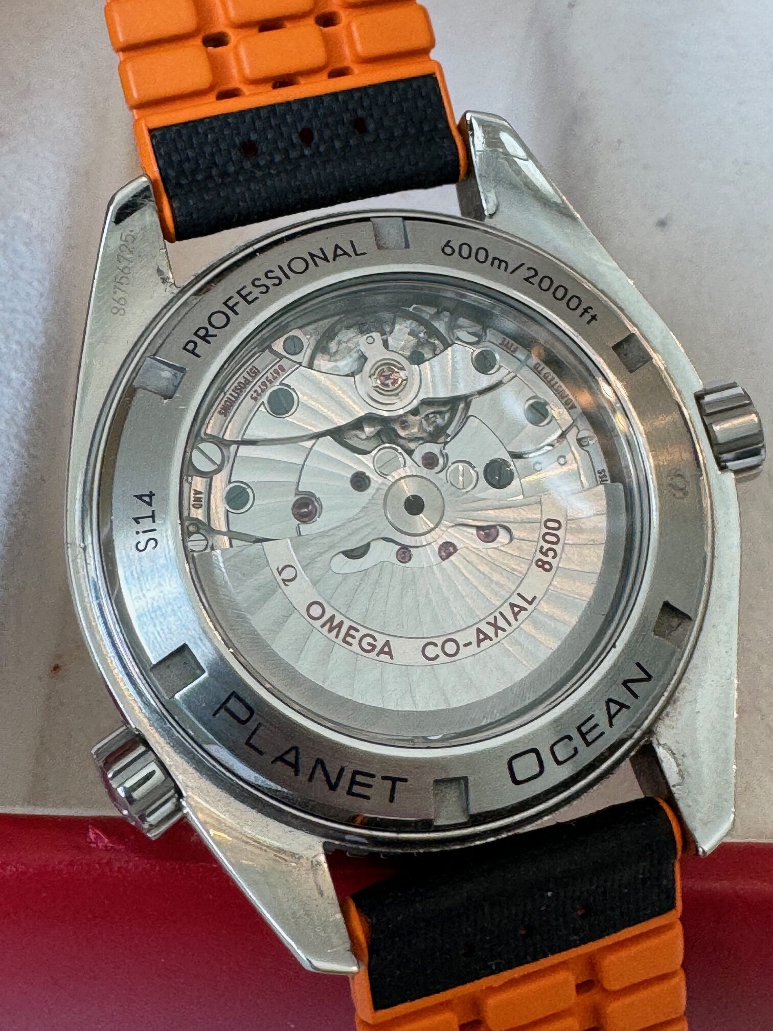 Tämä diveri kestää 60 ATM (600m) paineen ja sen Omega cal.8500 automaattikoneistolla on 60 tunnin käyntivara. Koneisto näkyvillä safiiri-lasin läpi. Kellon oranssi sukellus kehä on hienossa kunnossa. Rungossa on pieniä käytönjälkiä, teräsrannekkelle ja lukoille on juuri tehty kevyt kuorihuolto. Kello käy erinomaisesti.