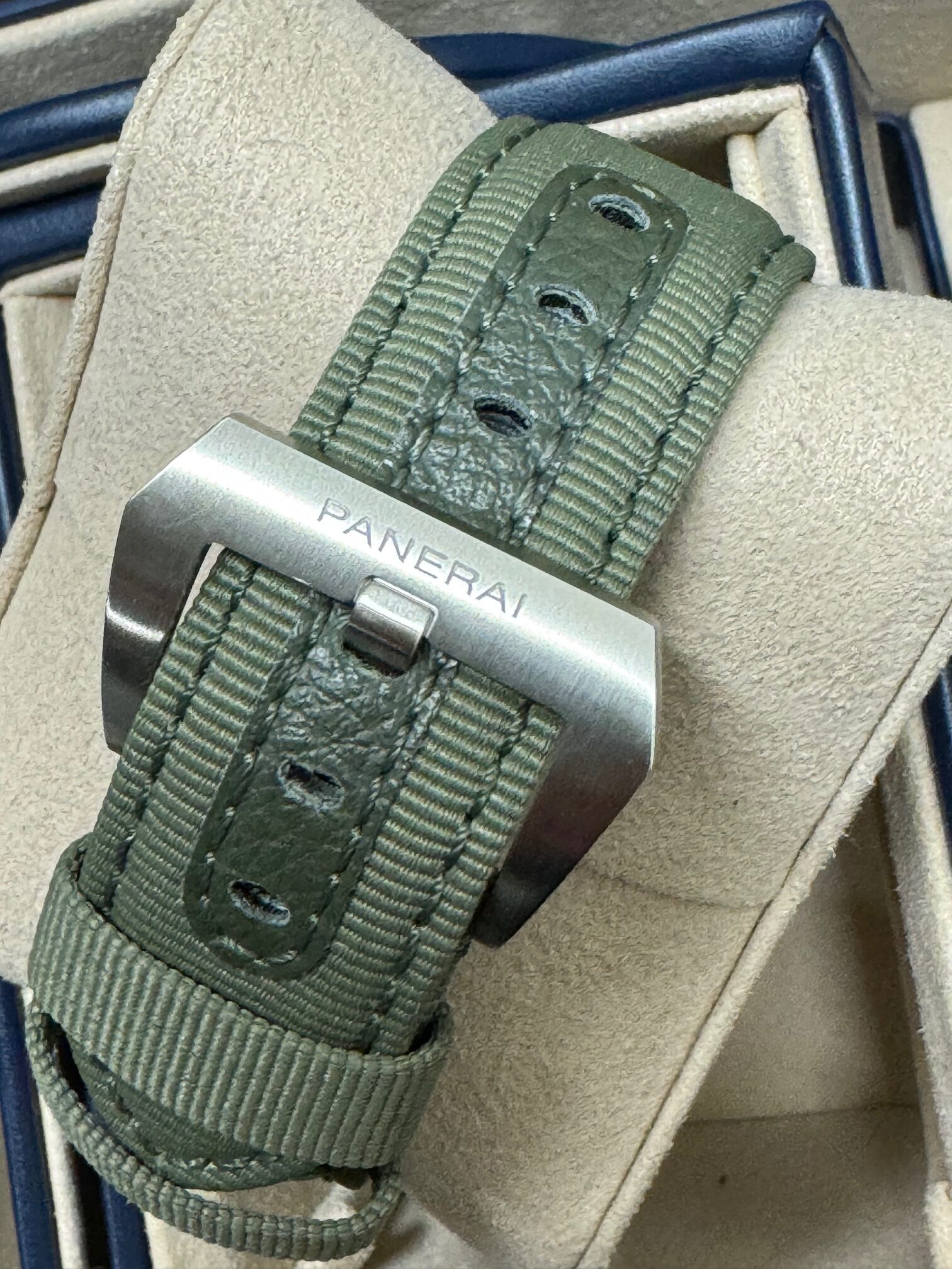 Tässä on Pannua ranteeseen. Kellossa on cal. P.900-automaattikoneisto, jolla on 3 päivän käyntivara. Kello kestää 30 ATM (300m) paineen ja kokoa on tuttu 44mm. Vihreä keraaminen sukelluskehä luo vihreän taulun ja rannekeen kanssa upean kokonaisuuden. Kellon kuuluu mukaan Panerain vihreä kumiranneke ja työkalu rannekeen vaihtoon.